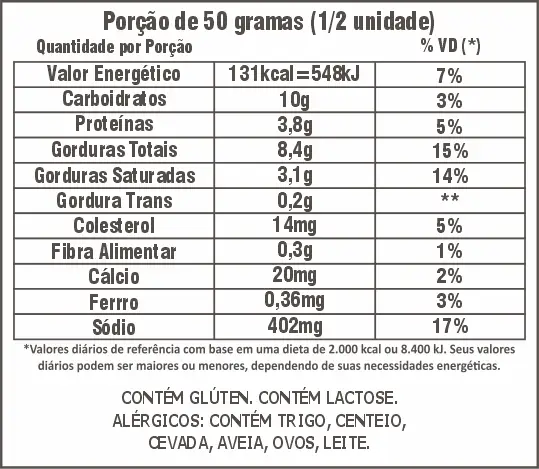 Farinha de trigo, salsicha, requeijão, mussarela, óleo de soja, mostarda, açúcar, fermento fresco e sal.