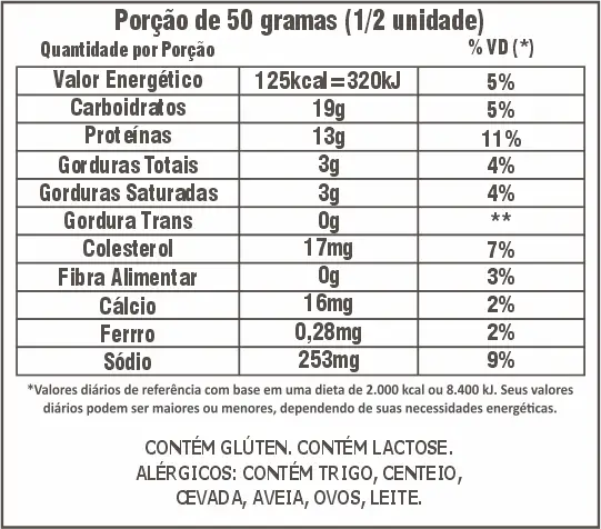 Farinha de trigo, carne, bacon, açúcar, margarina, óleo, cebola, tomate, limão, leite em pó, fermento fresco, alho, pimenta em pó e sal.