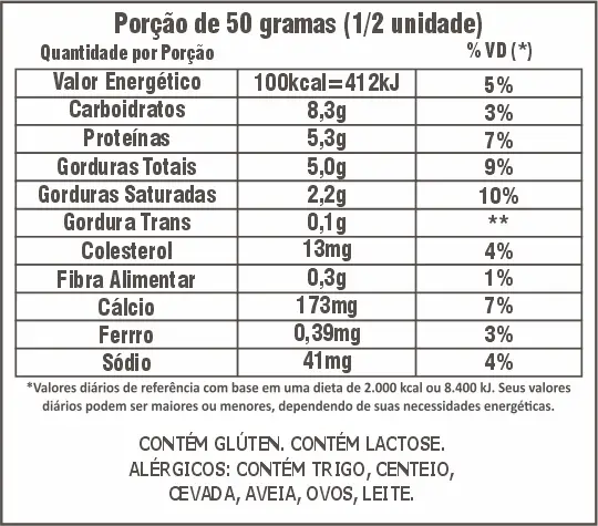 Farinha de trigo, hambúrguer de carne, presunto, mussarela, requeijão, cheddar, molho de tomate, óleo de soja, fermento biológico fresco, açúcar, melhorador, sal refinado e orégano.