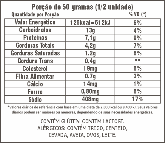 Mandioca cozida, água, carne moída, farinha de trigo, proteína de soja, tomate, cebola, margarina, sal, tempero, alho, caldo de galinha, leite em pó, conhaque, cebolinha, colorau, farinha de rosca e pimenta em pó.
